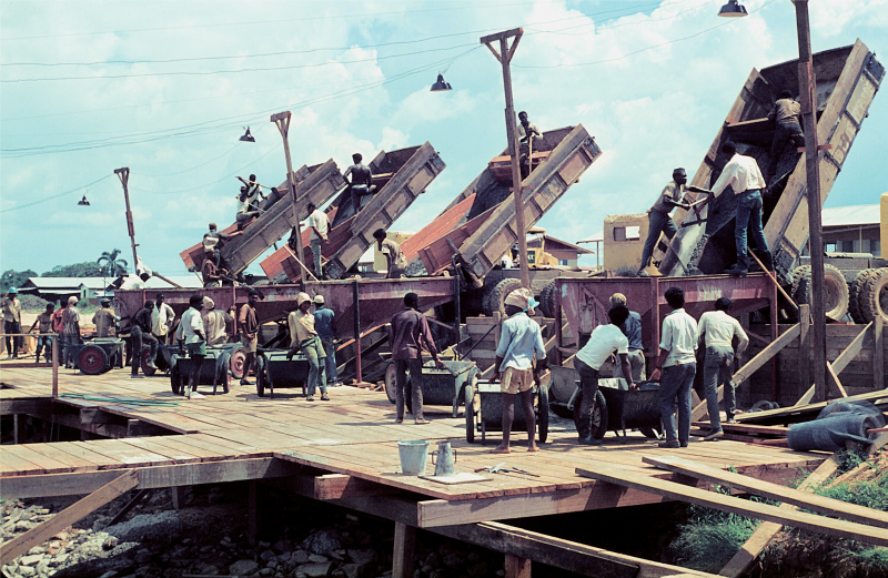 De foto’s van Sjaarda’s ingenieurswerk ademen de naoorlogse motoroliesfeer van modernisering en vooruitgang. Heipalen bij de aanleg van de Nieuwe Haven bij Paramaribo. De gloednieuwe start- en landingsbaan van de luchthaven Zanderij. Sluizen en vrachtwagens met beton.